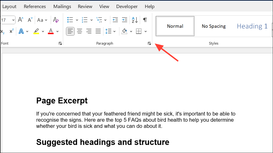 Step 2: Go to the Home tab, click the small arrow in the bottom-right corner of the Paragraph group to open the Paragraph dialog box.
