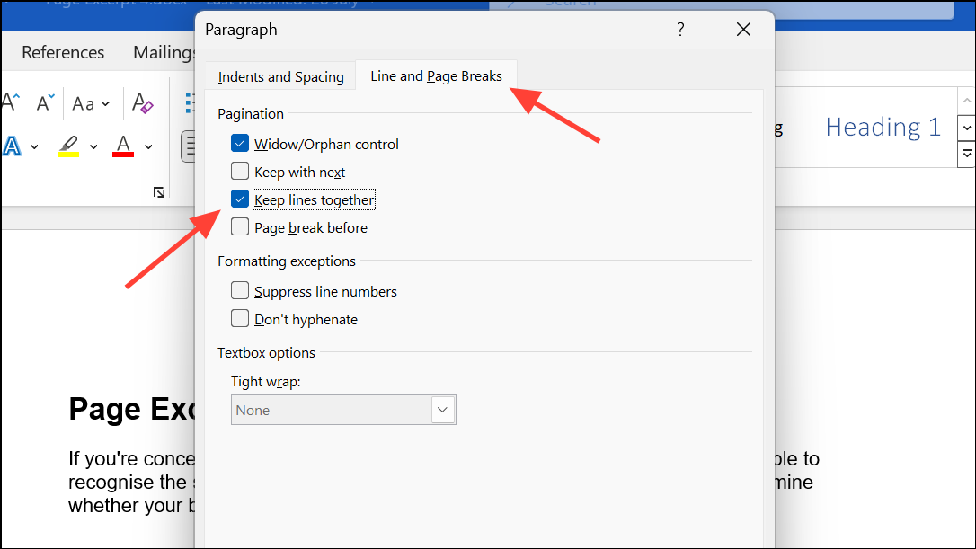 Step 3: Switch to the Line and Page Breaks tab. Check Keep lines together to ensure all lines in a paragraph stay on the same page, or check Keep with next to keep consecutive paragraphs together.