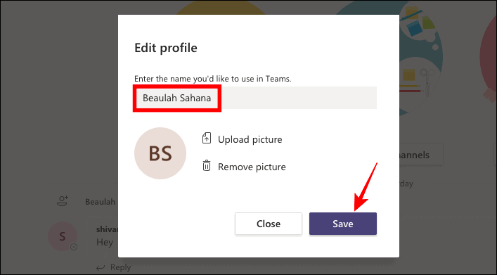 A popup window will open with options to edit your name and change your profile picture. In here, click on the text field where your name is shown and edit/change it to your preference. Click ‘Save’ when you’re done making changes.