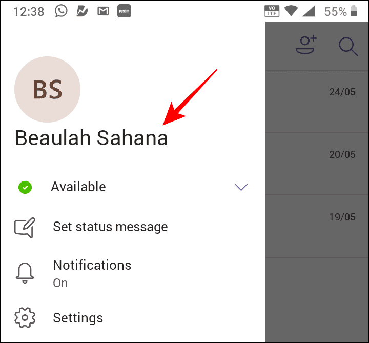 Tap on your name right below your profile picture (or initials) in the Teams app menu.