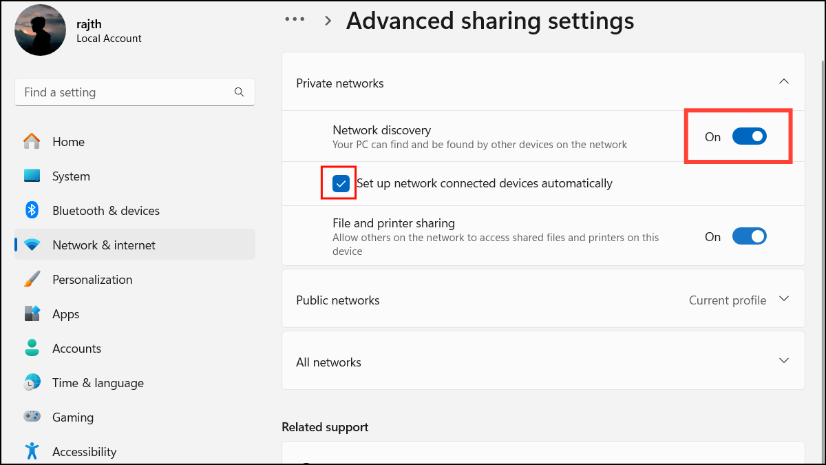 Step 3: Under the Private networks section, turn on the toggle for Network discovery and check the box for Set up network connected devices automatically.