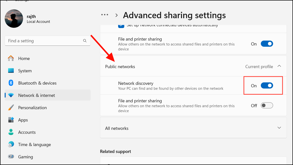Step 4: Expand the Public networks section and turn on the toggle for Network discovery as well.