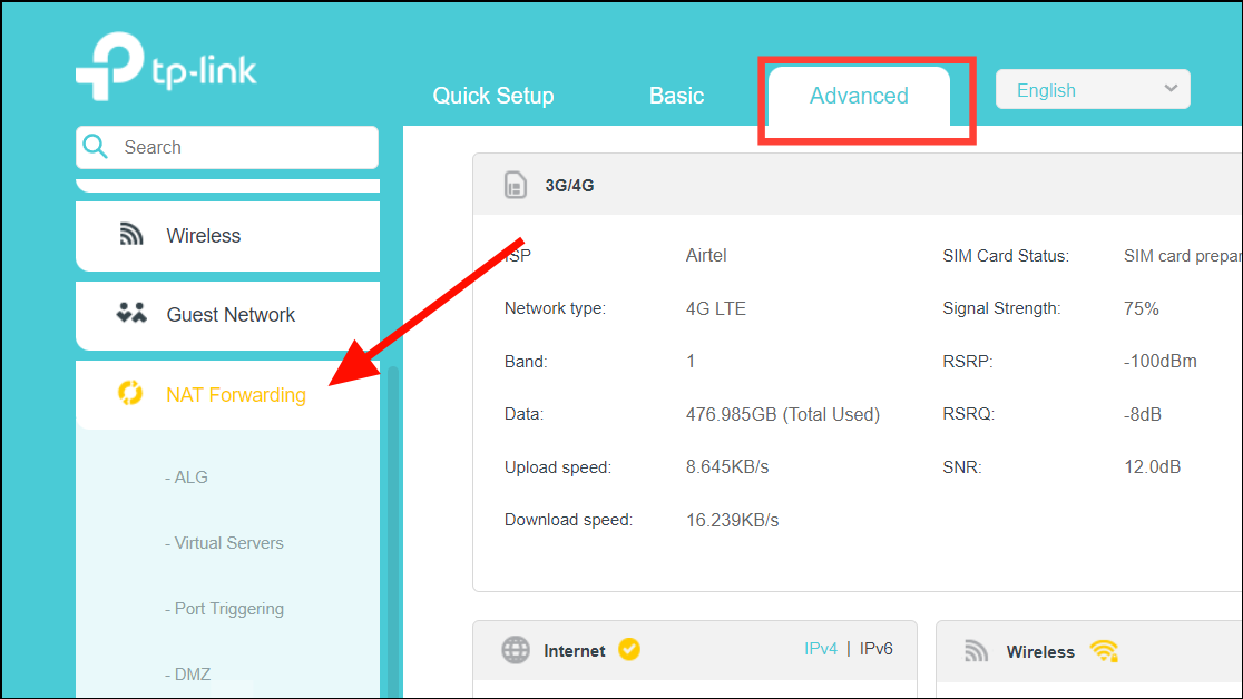 Step 2: Navigate to the Advanced settings, then find and select NAT Forwarding or Forwarding.