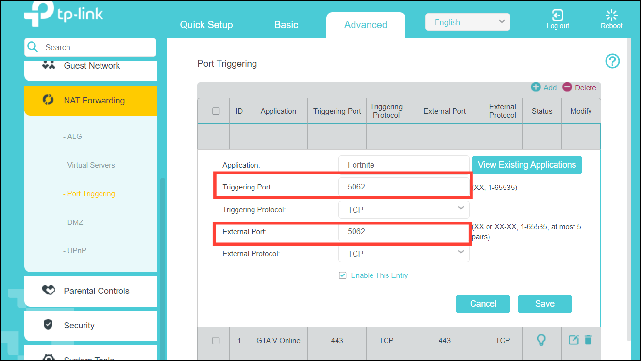 Step 7: Enter the port numbers required by your application in both the Internal and External Port fields. For example, if the game requires port 5062, input 5062 in both fields.