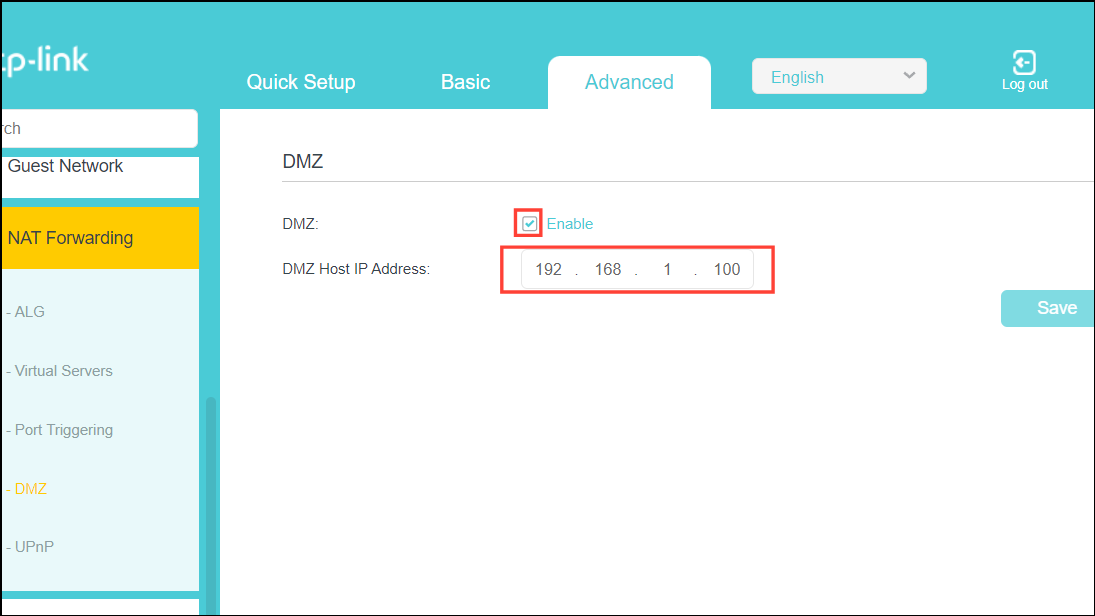 Step 3: Enable the DMZ option, enter your computer's static IP address, and click Save.