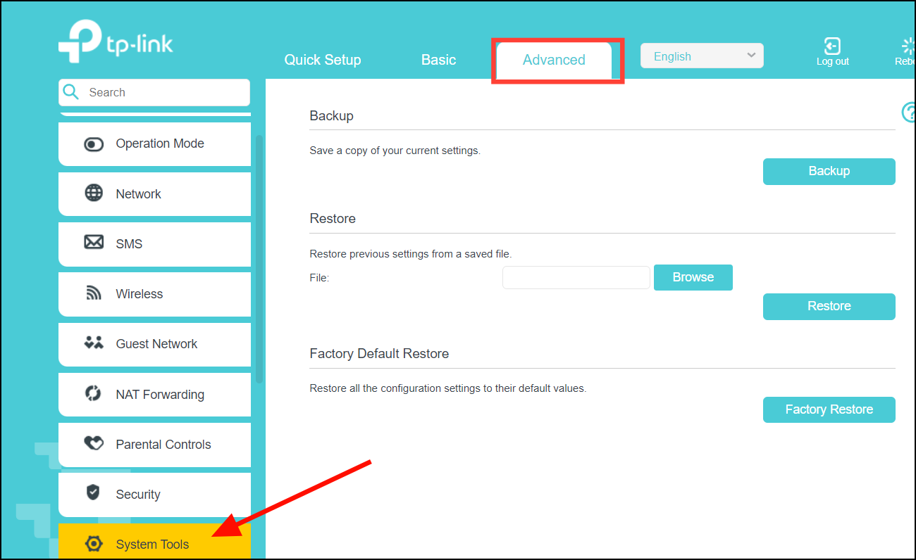 Step 1: Access your router's web interface and navigate to the Advanced settings, then select System Tools.