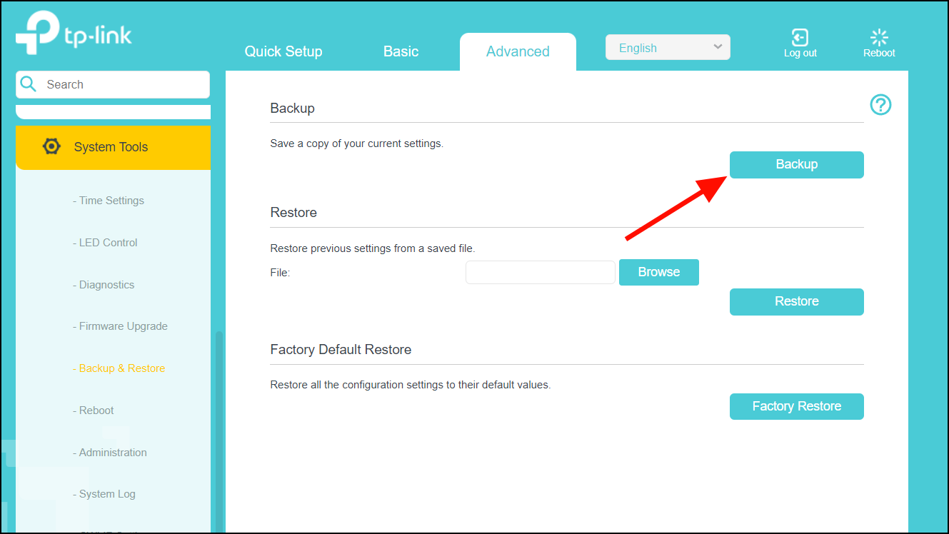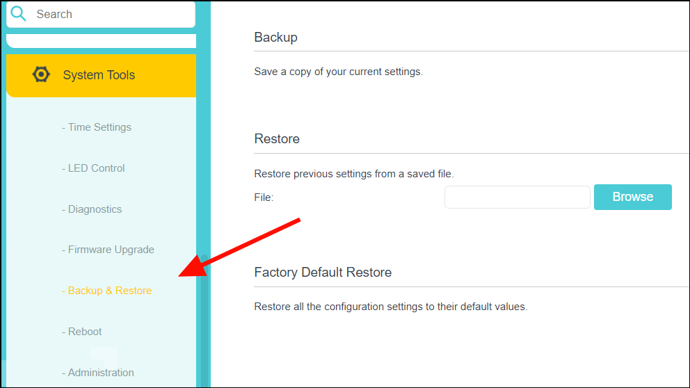 Step 2: Click on Backup & Restore or Save and Restore Settings to backup your current configuration before making any changes.