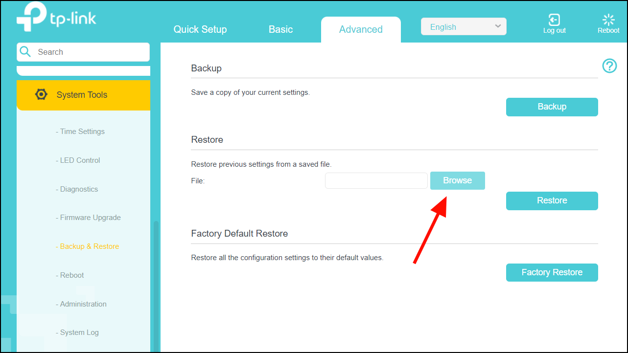 Step 10: Return to the router's web interface, and in the Backup & Restore section, click Browse under the Restore section to select the modified configuration file.