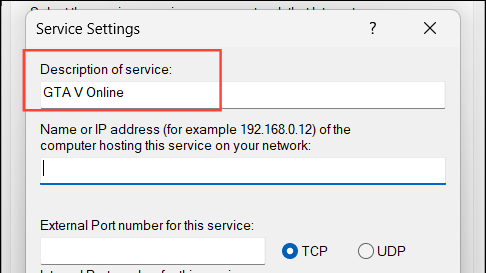 Step 5: Enter a description of the service (e.g., the name of your game) and input your computer's IPv4 address in the Name or IP address field.