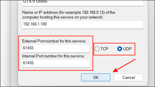 Step 5: In the configuration window, enter a name for the service or application (e.g., the name of your game), and input your computer's static IP address in the Device IP Address field.