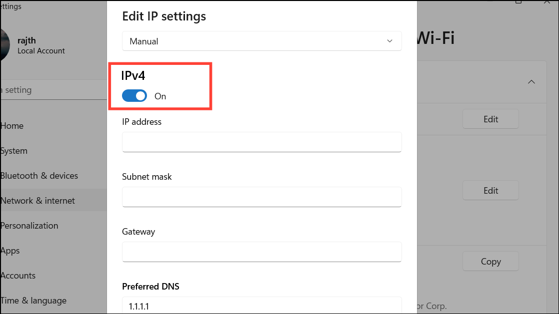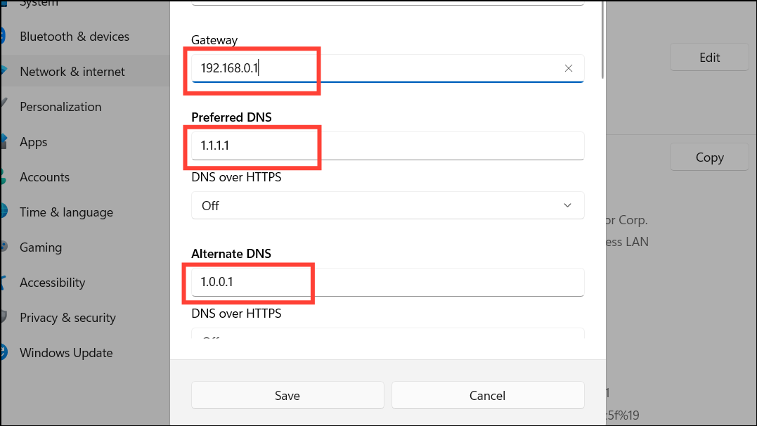 For the IP address, choose a unique address within your router's range, typically between 192.168.0.2 and 192.168.0.254. The Subnet mask is usually 255.255.255.0 for home networks. For the Gateway, enter your router's IP address, commonly 192.168.0.1 or 192.168.1.1; you can find it on your router or by running the ipconfig command in Command Prompt. Enter a Preferred DNS server, such as 1.1.1.1 (Cloudflare) or 8.8.8.8 (Google), and an Alternate DNS server like 1.0.0.1 (Cloudflare) to ensure continuous connectivity if the primary DNS fails.