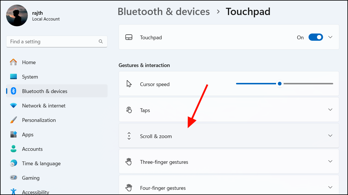 Step 2: In the Settings window, navigate to the 'Bluetooth & devices' section on the left sidebar, then click on 'Touchpad' on the right pane.