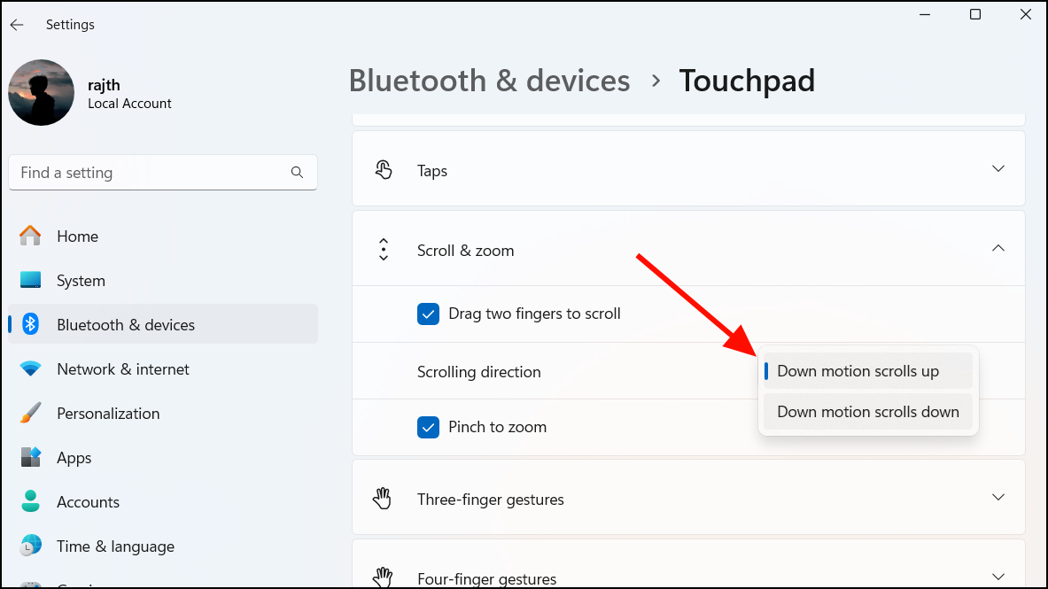- Down motion scrolls up: Swiping upward on the touchpad will scroll down the page (reverse scrolling).