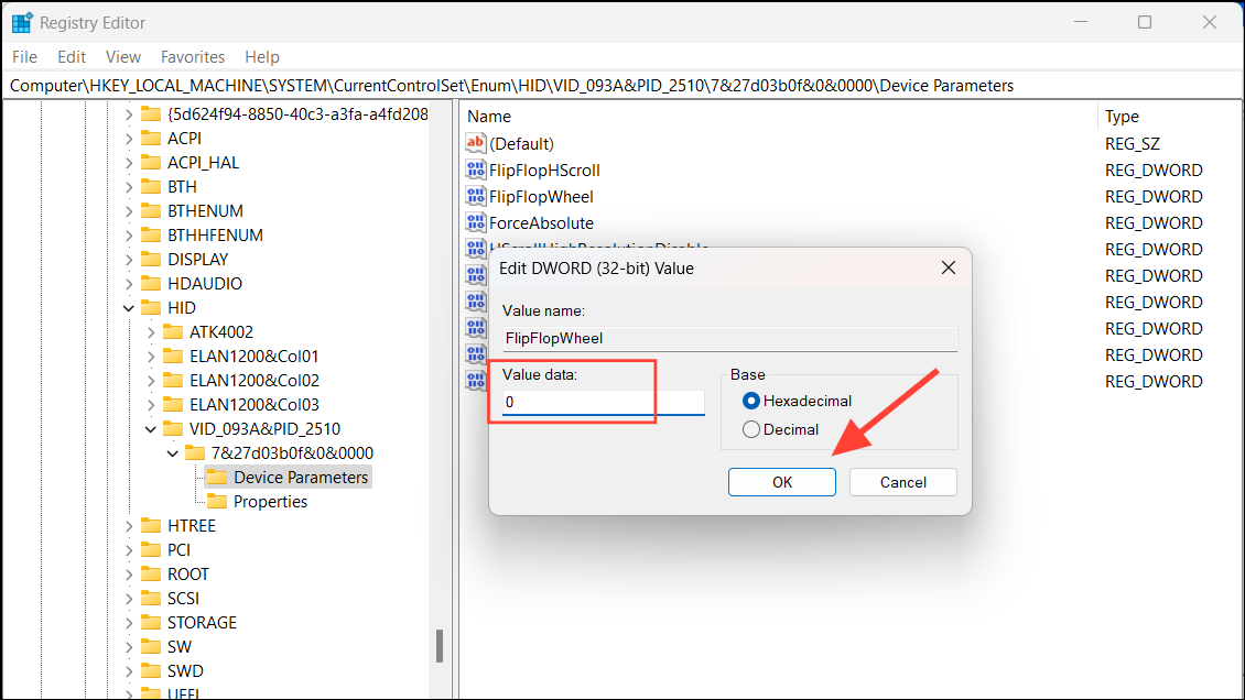 Step 5: Click on 'Device Parameters' and look for the 'FlipFlopWheel' entry in the right pane. This value controls the scroll direction of your mouse.
