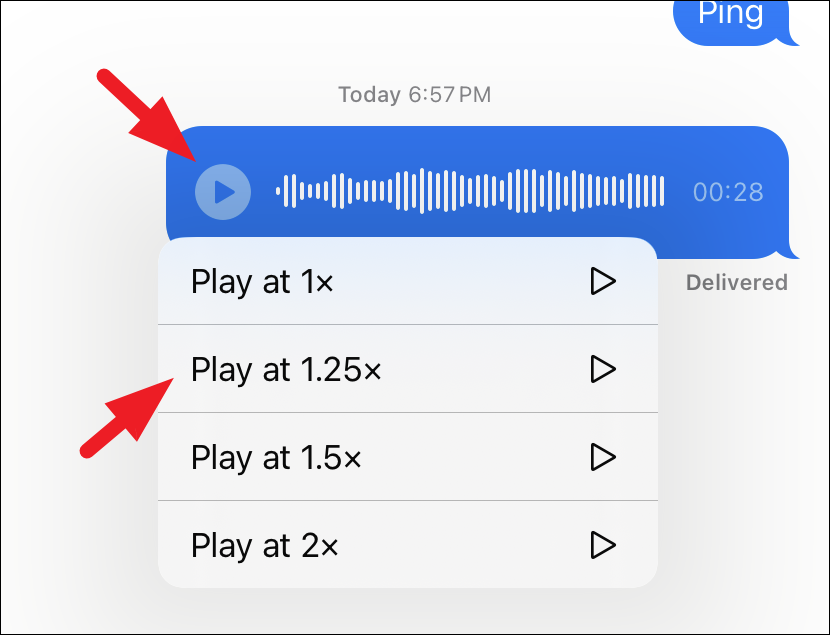 Find the audio message and long tap on the play button. This will bring the playback speed options (1x, 1.25x, 1.5x, and 2x) to your screen. Select a suitable speed from the menu to apply it.