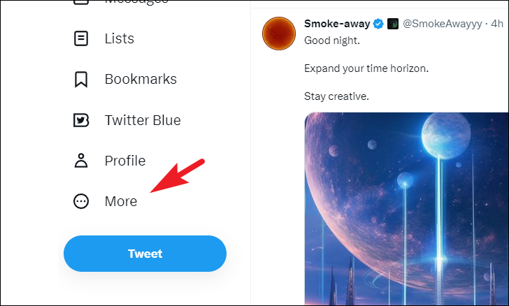 First, head to twitter.com and sign in using your credentials. Once you are at the Home Page, click on the 'More' tab from the left sidebar.