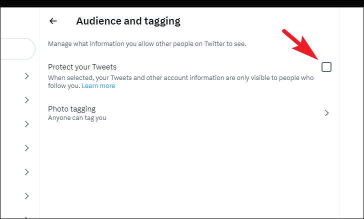 To make sure your tweets and account information is only visible to people that follow you, click on the 'Audience and tagging' option.