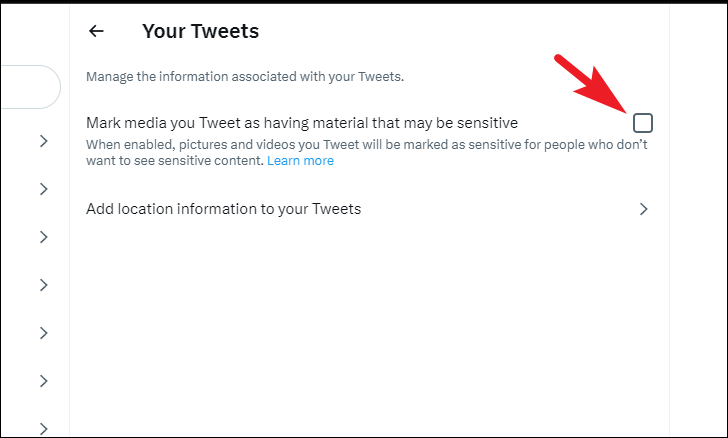 Then, select the 'Mark media you Tweet as having material that may be sensitive' option.