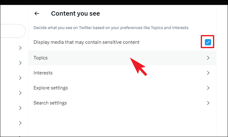 On the next screen, if you wish to see sensitive content without being notified of it first in your feed, click on the checkbox following the 'Display media that may contain sensitive media' option. To manage topics, click on the 'Topics' tile to continue.