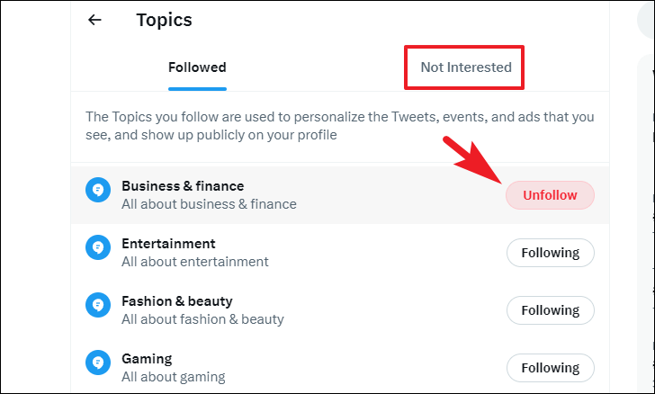 To unfollow a topic, click on the individual 'Following' button for each topic. It will change to 'Unfollow' as you hover over it; click on it to unfollow. You can also head to the 'Not Interested' section to see the list of topics you have marked as not interested.