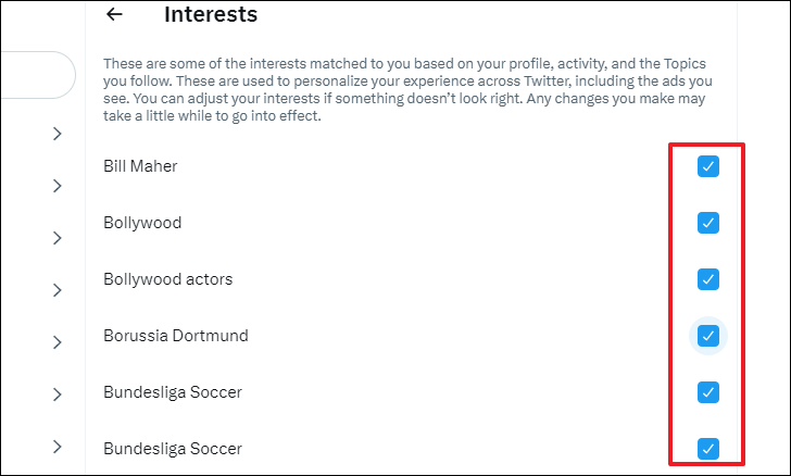 After that, you will be able to see all the interests you had manually selected at the time of account creation along with the topics Twitter automatically added based on your profile and activity. The interests shown on the page also impact the adverts delivered to you across the website.
