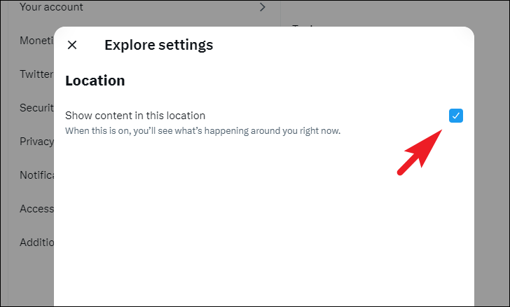 Twitter also displays content depending on your location. If you wish to turn off this setting, click on the 'Explore settings' tile. This will bring an overlay window to your screen.