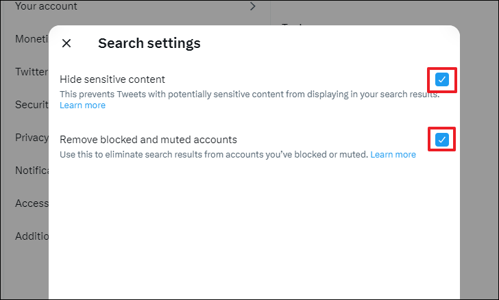On the overlay window, uncheck the 'Hide sensitive content' option. Next, to see search results from blocked/muted account(s), uncheck the 'Remove blocked and muted accounts' option.