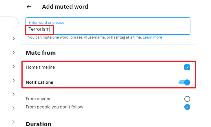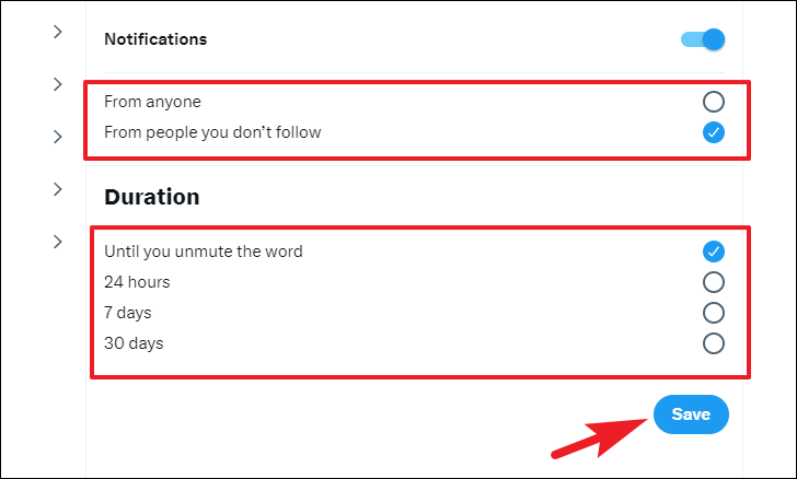 After that, choose the audience. The options are pretty self-explanatory; you can either choose to mute tweets/notifications from everyone or only from people you do not follow on Twitter. To choose, click on the option you deem fit. Also, select a duration for the muted words, you can either choose to disable the muted words automatically or you can do so manually. Choose the option suitable for you and then finally click on the 'Save' button.