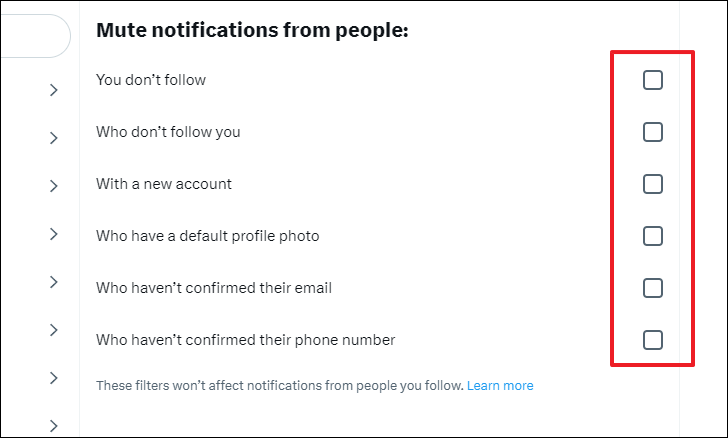 After that, click on the individual checkbox following the option to select it. You can select multiple options. Also, do note that these filters will not impact notifications from people that you already follow.