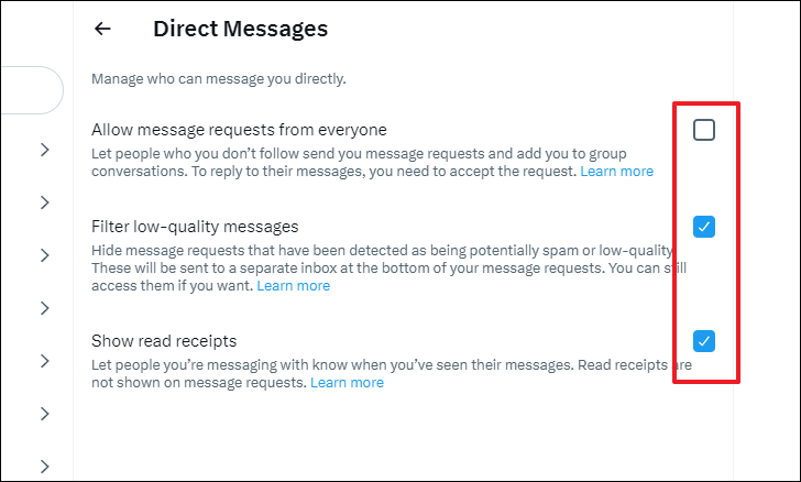 If you wish to allow message requests from everyone, click on the checkbox following the respective option. By default, Twitter filters low-quality messages that are likely to be spam. If you wish to disable the filter, uncheck the 'Filter low-quality messages. Similarly, read receipts are turned on by default. To disable them, uncheck the 'Show read receipts' option.