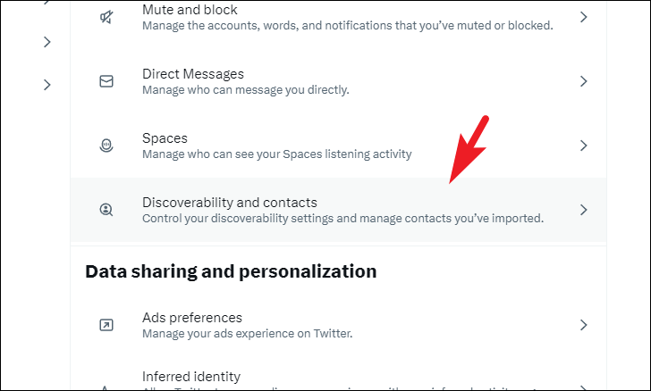 To manage your discoverability on Twitter, click on the 'Discoverability and contacts' tile to proceed.