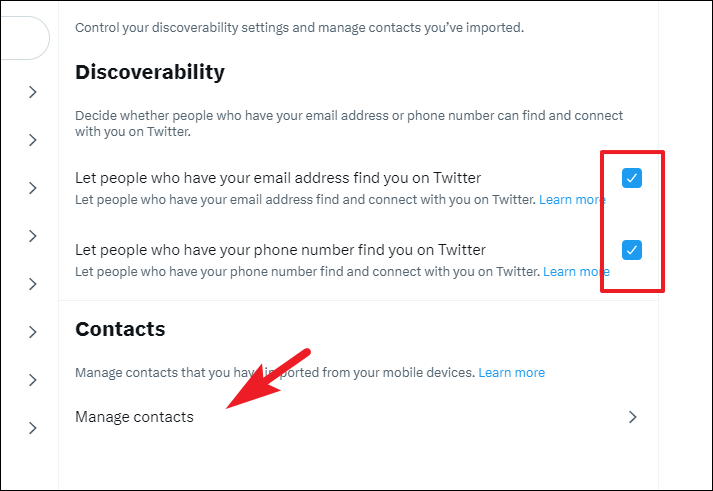If you do not want to allow people who have your email address and phone number to let you find on Twitter, uncheck both options individually. You can also remove or deselect contacts by clicking on the 'Manage contacts' tile.