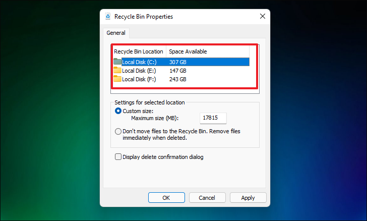Step 4: Select the drive for which you want to adjust the Recycle Bin storage size.