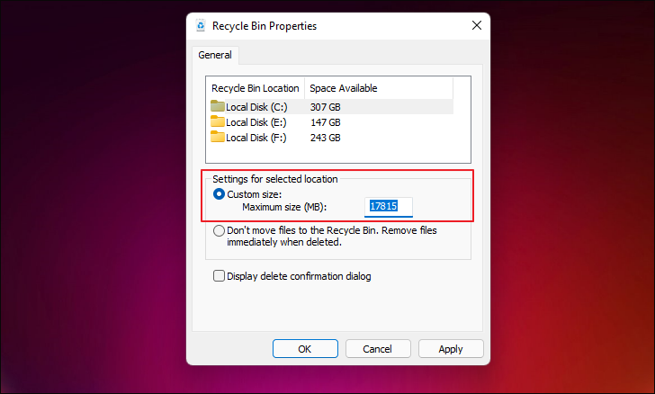 Step 5: Under 'Settings for selected location', select the 'Custom size' option. Enter the maximum size you want to allocate for the Recycle Bin in megabytes (MB) next to 'Maximum size (MB)'. For example, to allocate 15000 MB (approximately 15 GB), type '15000' in the box.