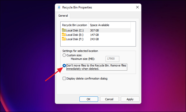 If you prefer to permanently delete files from a specific drive without sending them to the Recycle Bin, you can disable the Recycle Bin for that drive.