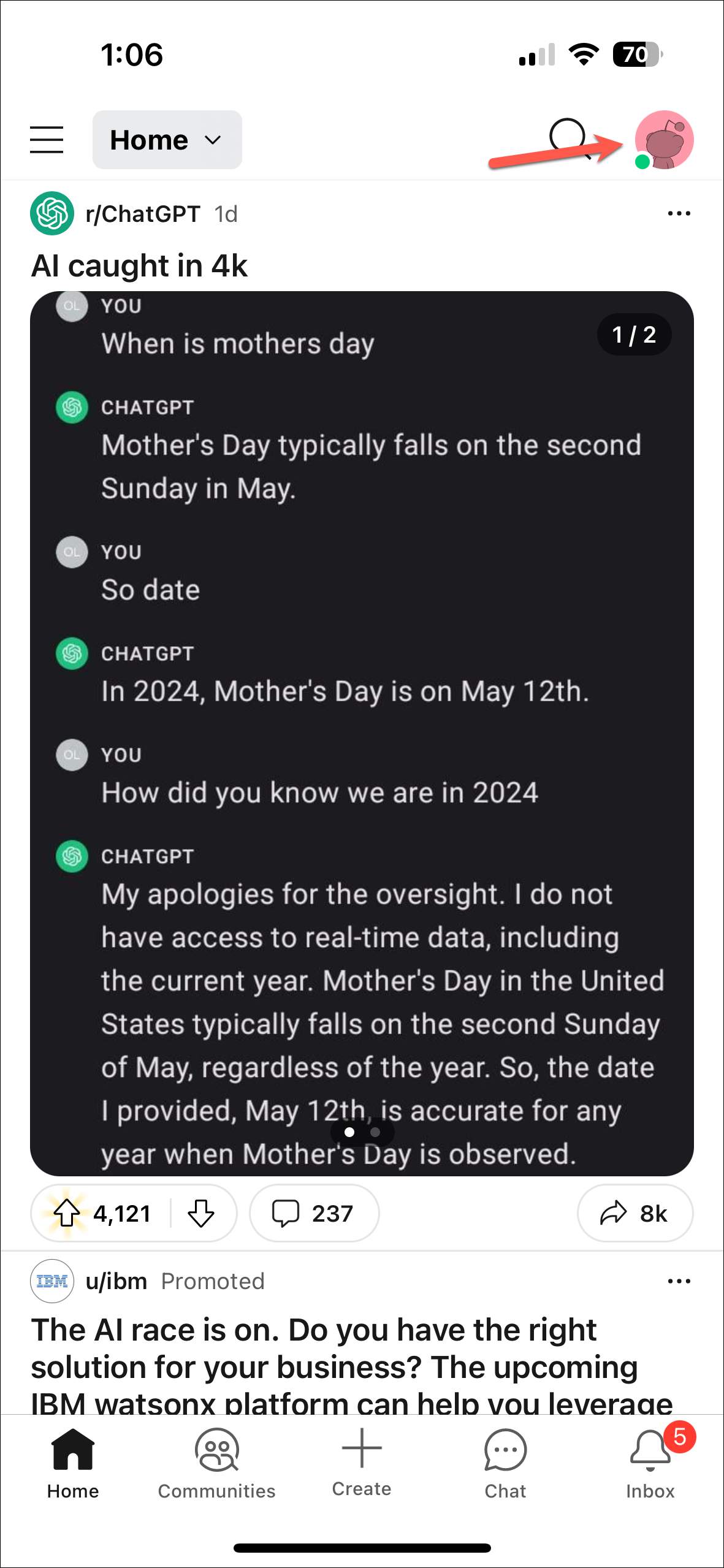 - Navigate to the 'Home' tab of the Reddit app and tap the 'Profile' icon in the top-right corner of the screen.
