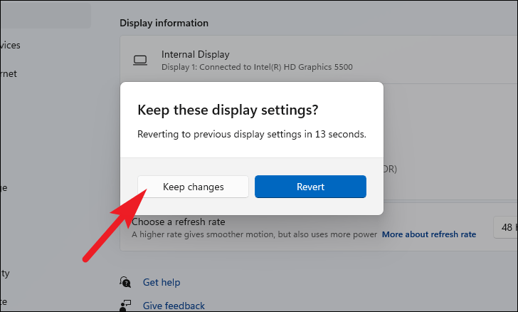 - A confirmation prompt will appear. Click Keep changes to apply the new refresh rate, or select Revert to go back to the previous setting.