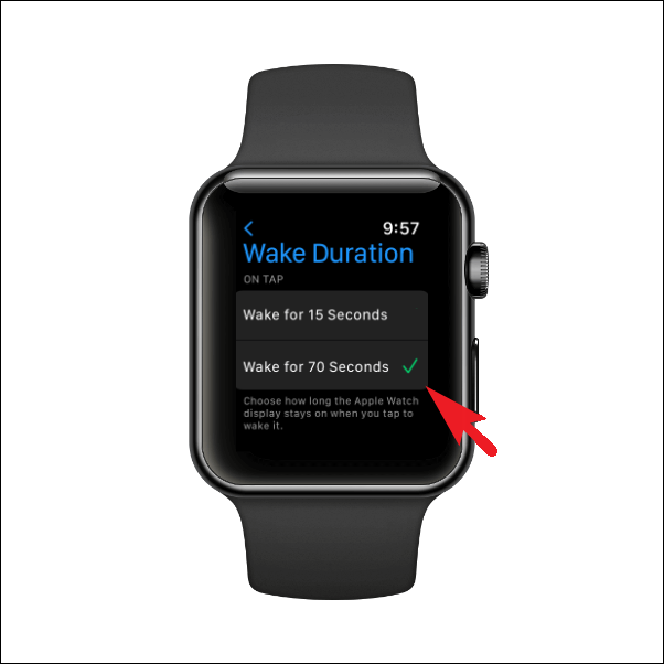 Then, on the ‘Wake Duration’ settings screen, tap on the ‘Wake for 70 seconds’ option to apply the settings immediately on your Apple Watch.