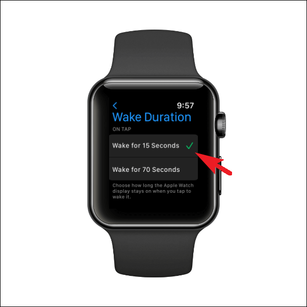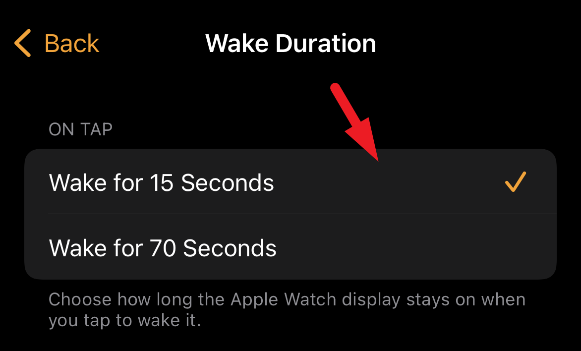 In case you are here to reduce the screen wake time for your Apple Watch, tap on the ‘Wake for 15 seconds’ option to apply the settings immediately.