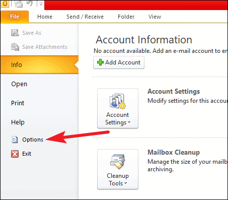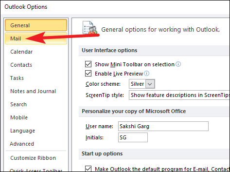 A dialog box for Outlook options will open. Go to ‘Mail’ from the navigation menu on the left.