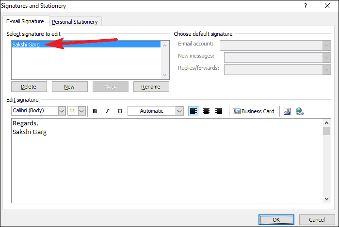 The Signatures and Stationery dialog box will open. Stay on the E-mail Signature tab. Select the signature you want to edit. Then, edit the contents from the ‘Edit Signature’ textbox. You can even use formatting options like font, size, bold, italic, etc. You can even add images in the signature if you want to add your company logo.