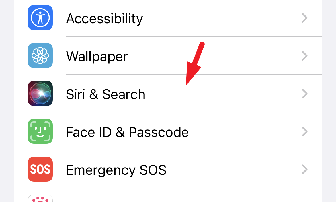 After that, on the ‘Settings’ screen, scroll down to locate and tap on the ‘Siri & Search’ option to continue.