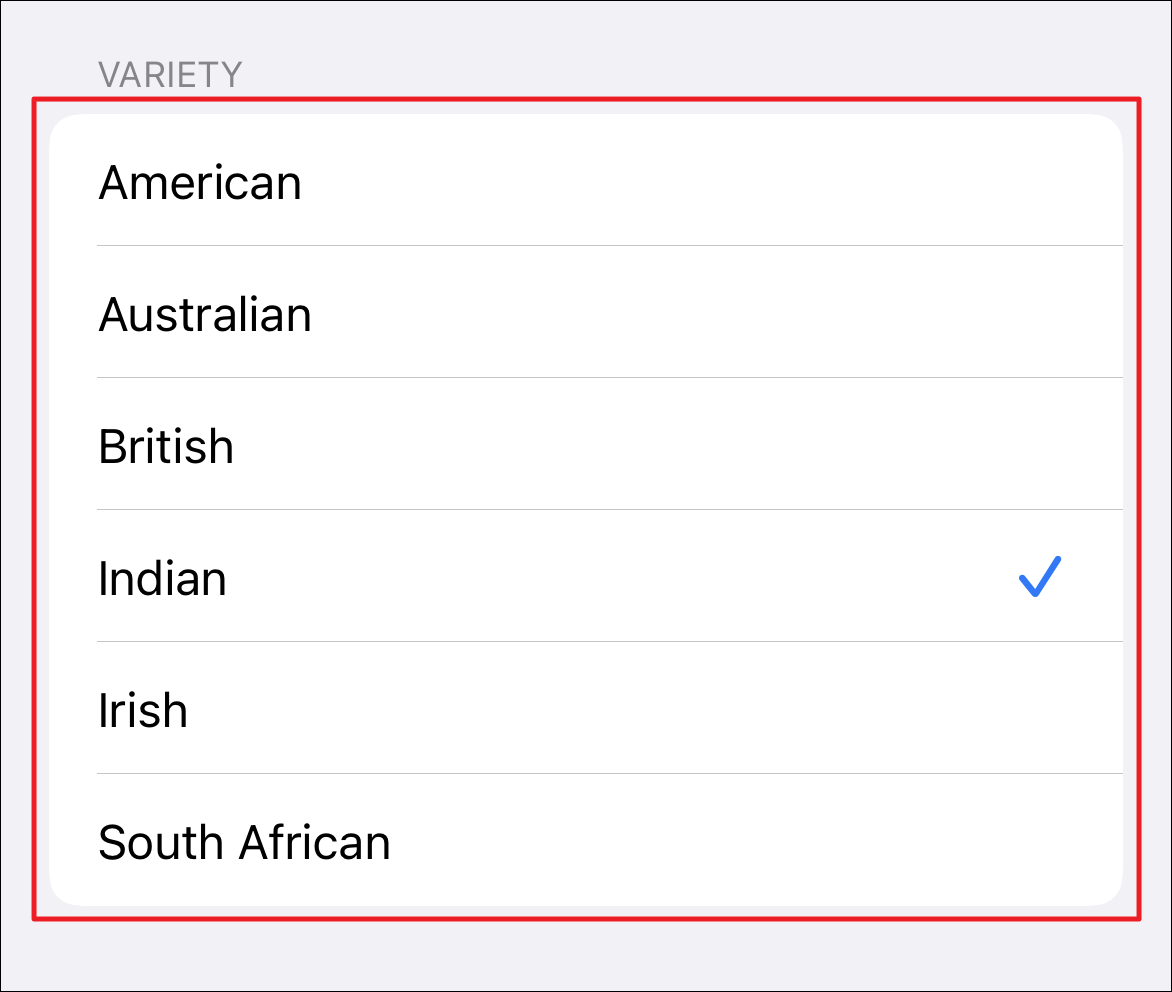 Now, in case you do not wish to change the gender but only the accent of the voice, tap to select an option and play a sample of the voice present under the ‘Variety’ section on your screen. Apple at the time of writing this article offers American, Australian, British, Indian, Irish, and South African accents for Siri.