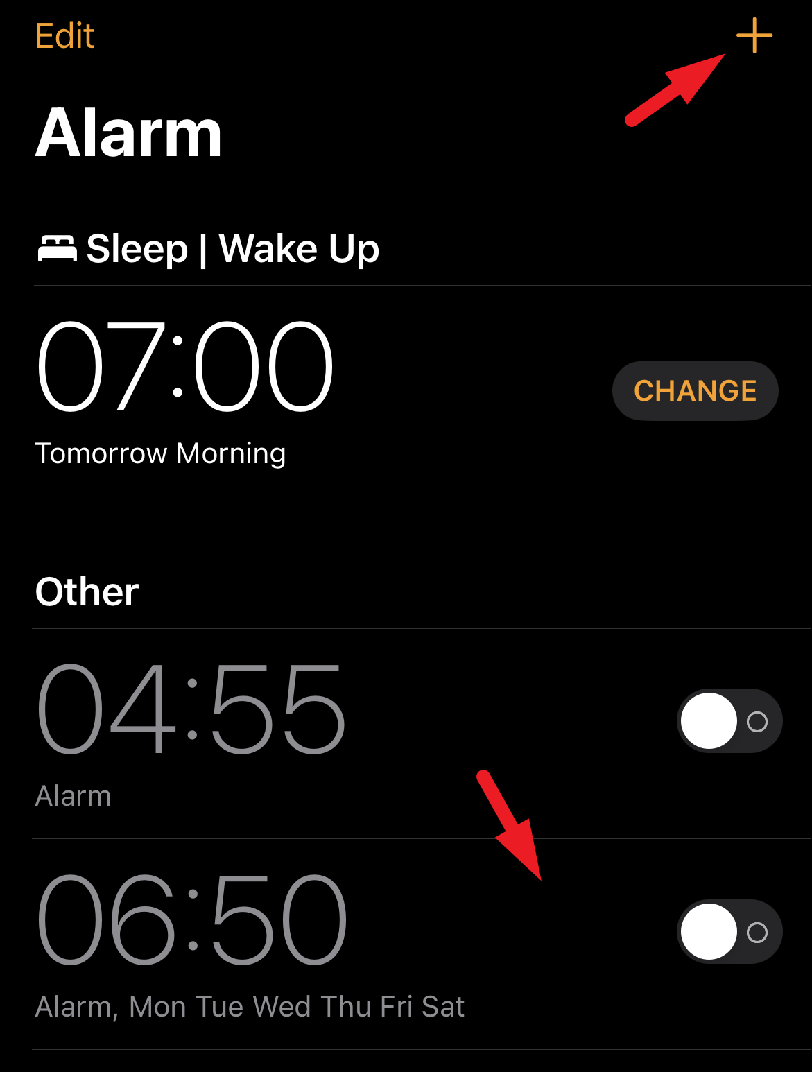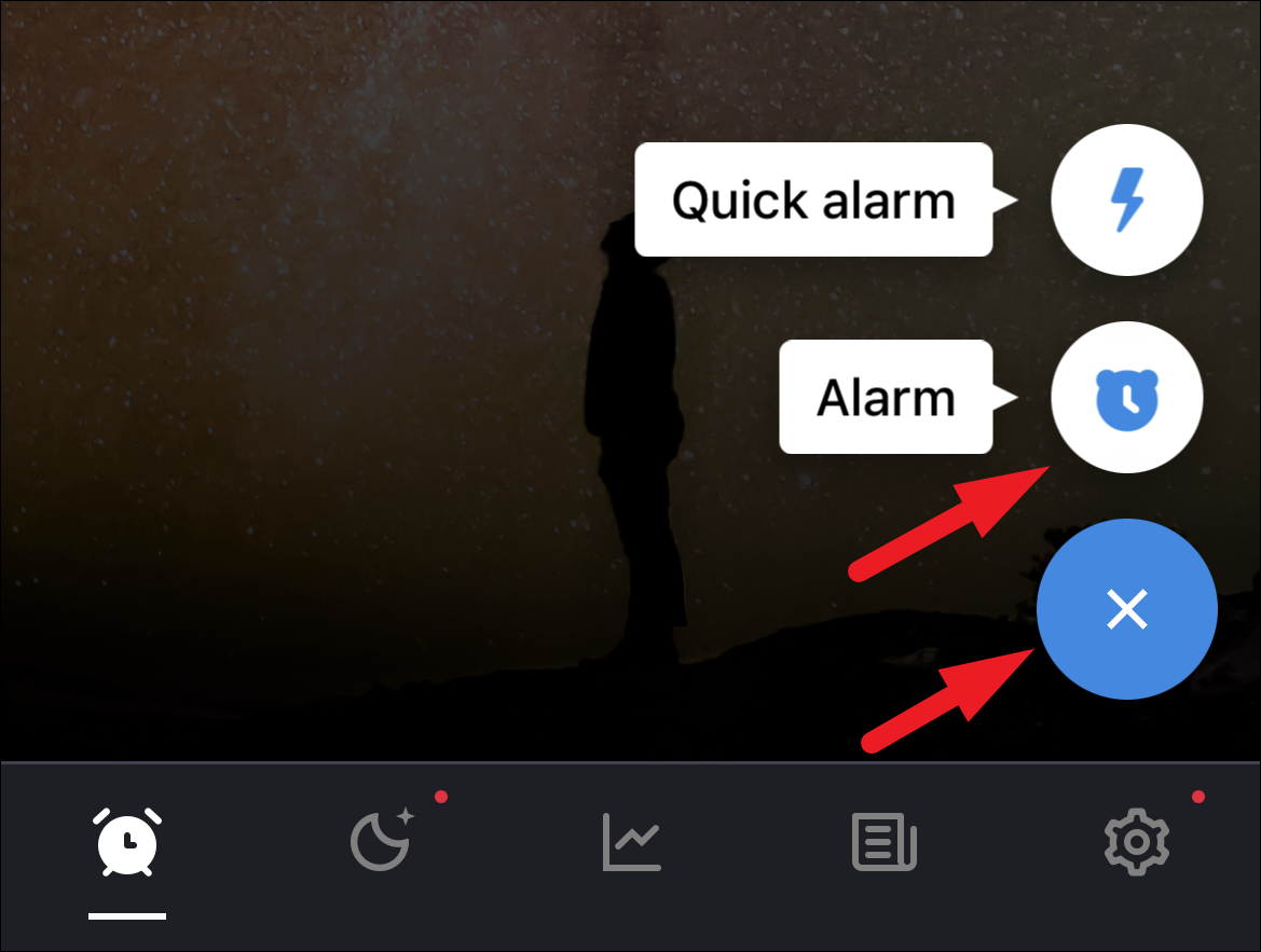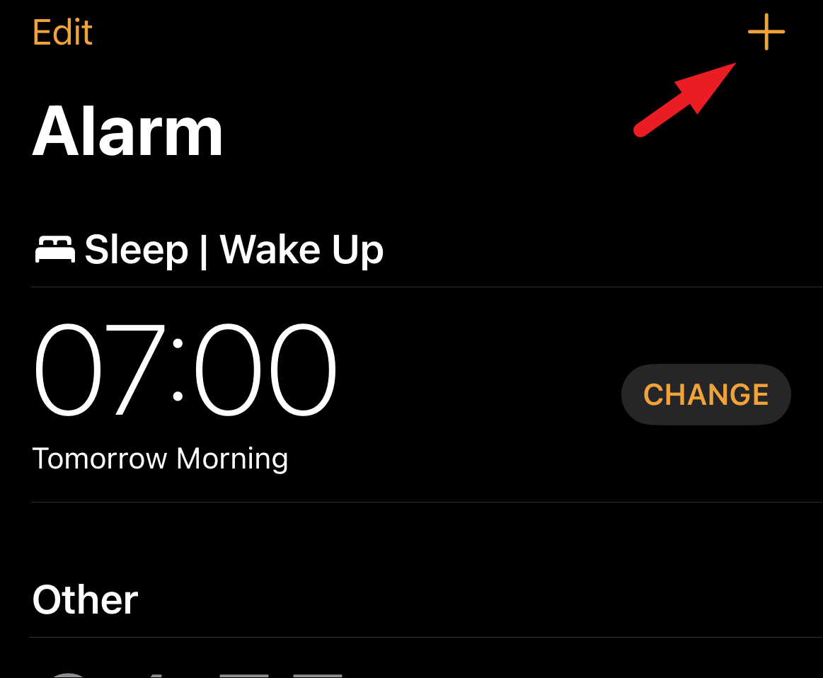 Once you are back on the main alarm screen, tap on the ‘+’ button to create a new alarm.