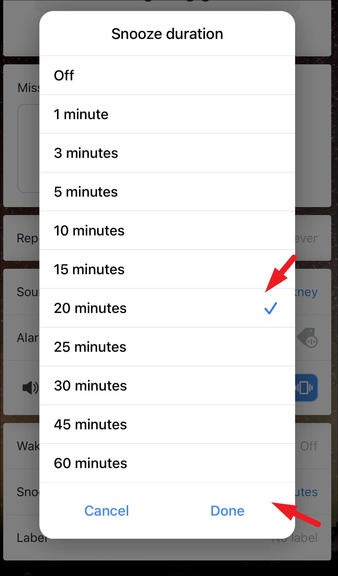 Next, tap on the duration you wish to set as the snooze time. Then, tap on the ‘Done’ button to confirm.