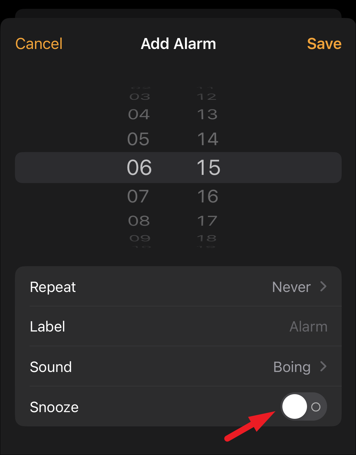 Next, tap on the toggle switch following the ‘Snooze’ option to bring it to the ‘Off’ position, if it was not already turned off. Then, tap on the ‘Save’ button.