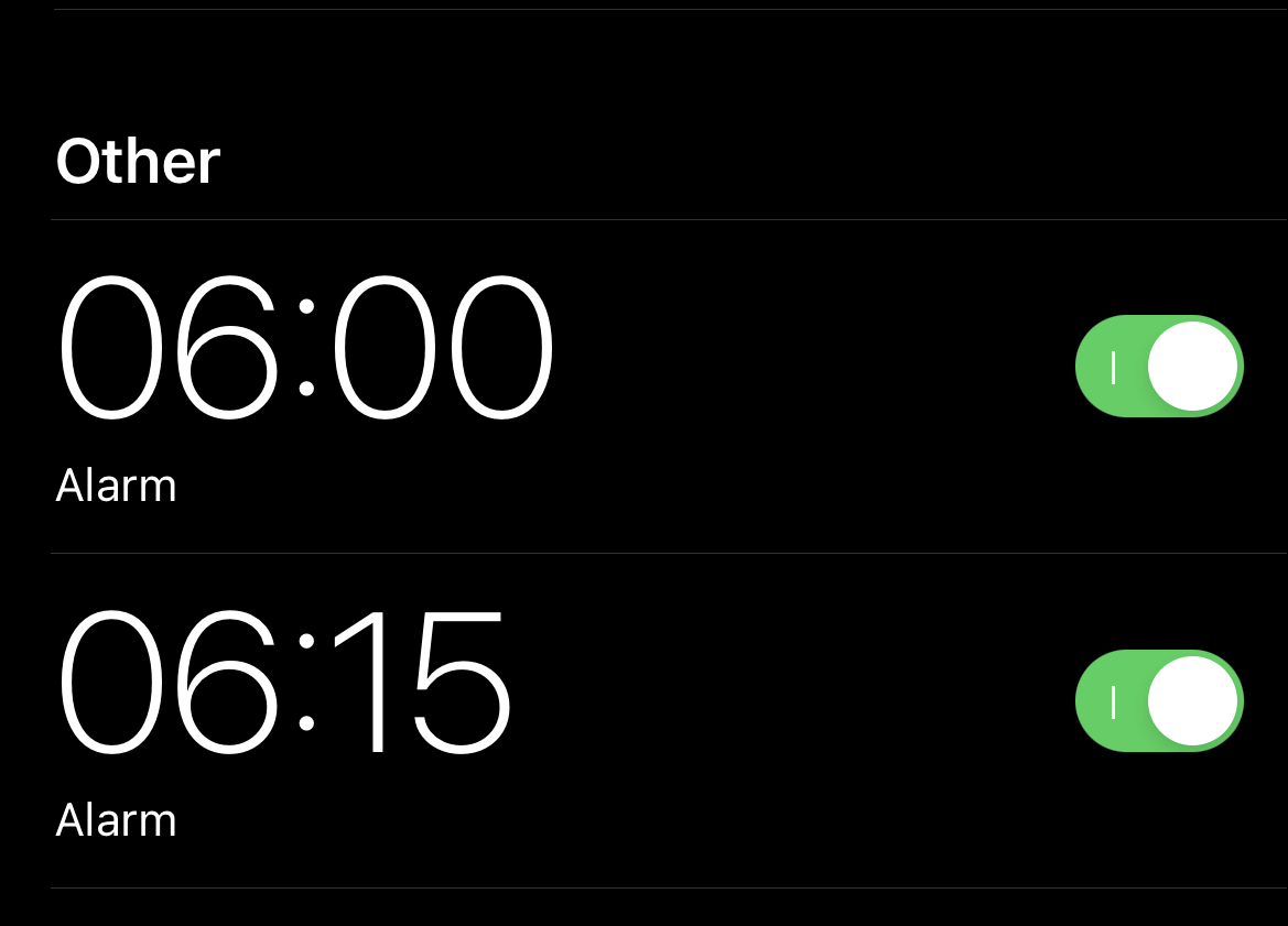 Now, set the alarm ahead by the number of minutes you wish to keep as your snooze time, i.e., if you wish to have 15 minutes of snooze time and your first alarm is at 6:00 AM, set the second alarm at 6:15 AM. Once set, your alarms should look like in the screenshot below.