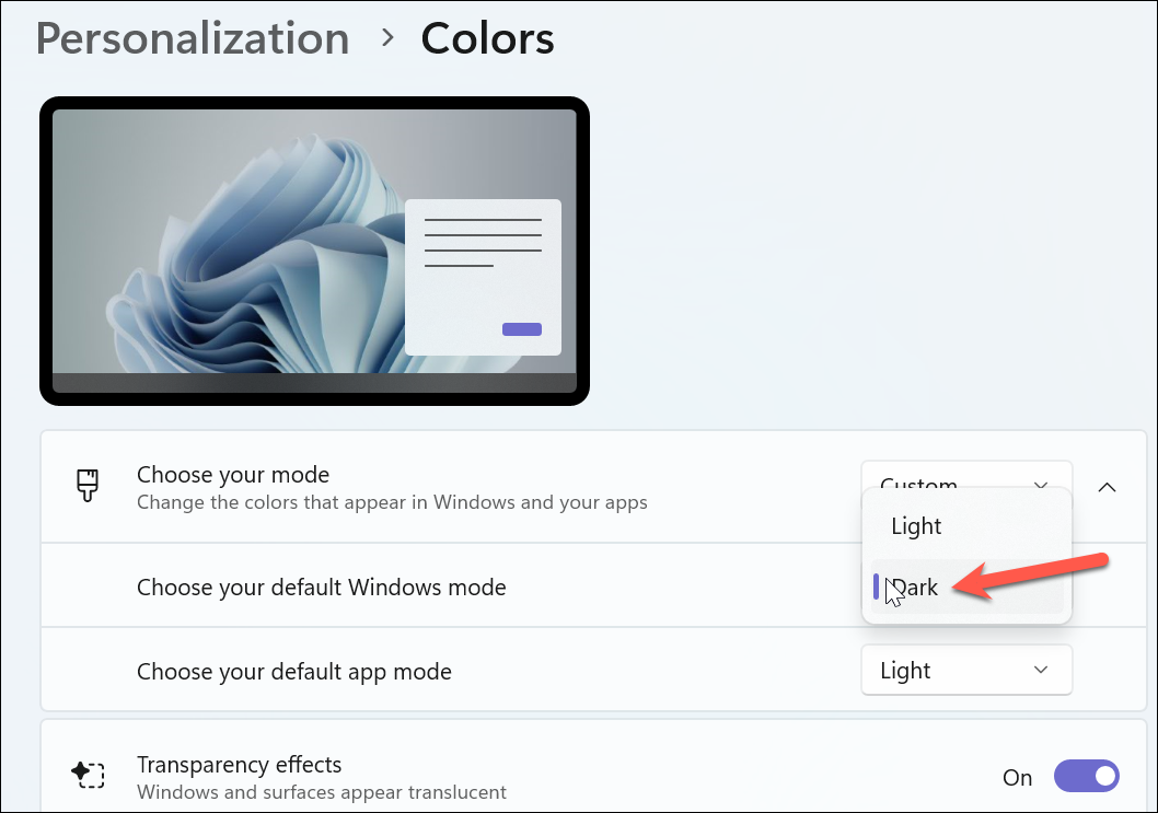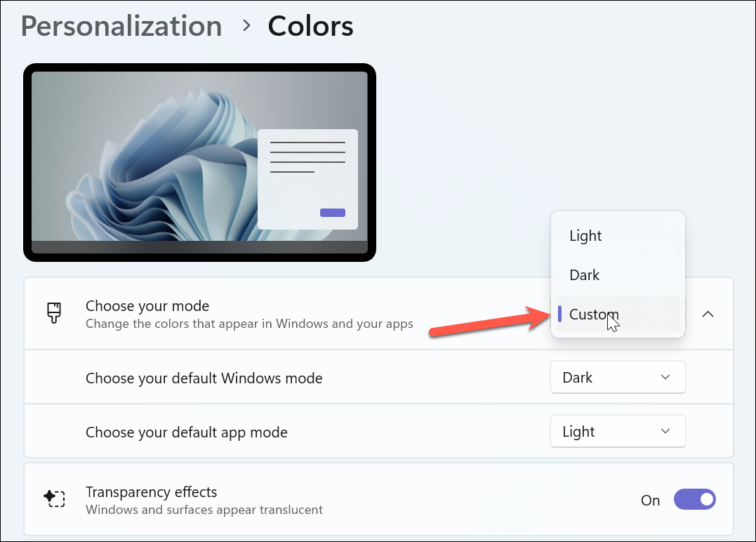 Step 4: Under the Choose your mode dropdown menu, select either Dark or Custom. Choosing Dark will apply the dark theme to Windows and apps, while Custom allows you to set different themes for Windows and apps.