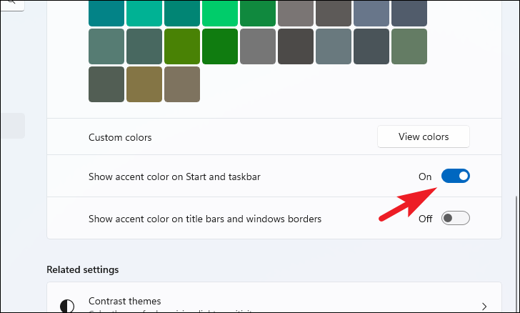 Step 8: After selecting your accent color, toggle on the option Show accent color on Start and taskbar. This will apply your chosen color to the taskbar and Start menu.