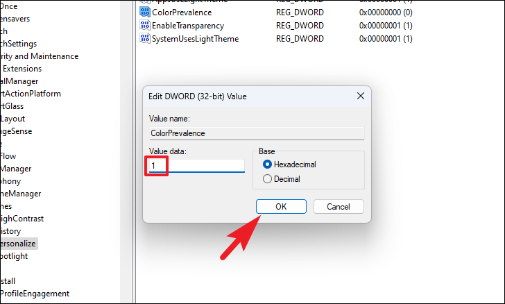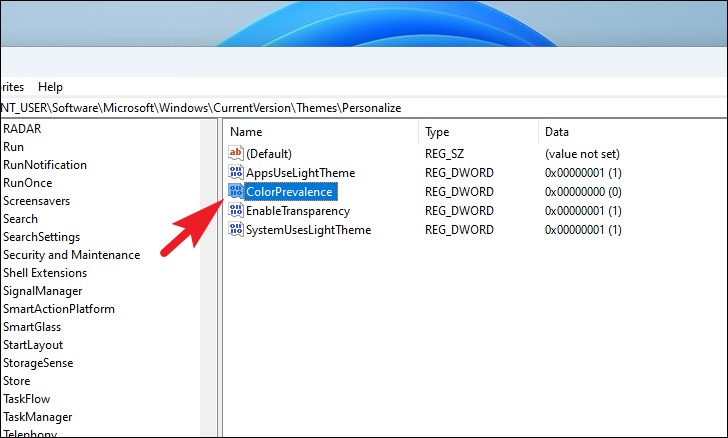 Step 3: In the right pane, find the ColorPrevalence DWORD entry and double-click on it to edit its value.